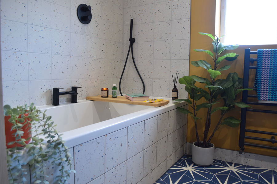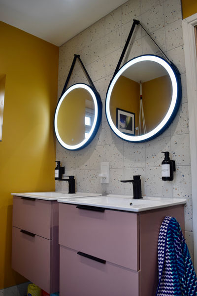 This space was transformed from a plain and ordinary space in to one that couldn't be more different. It is bright, bold and uplifting as well as being larger in its footprint. Where previously there had been inbuilt cupboards to house the boiler, these were knocked out and the door frame moved slightly to fit the bath in this space. Now with two sinks and accompanying mirrors, this space is bigger and more accommodating for a growing family. The bathroom feels fun yet luxurious, especially with the underfloor heating and other gadgets for modern life such as the wall mounted electric toothbrush charging point.